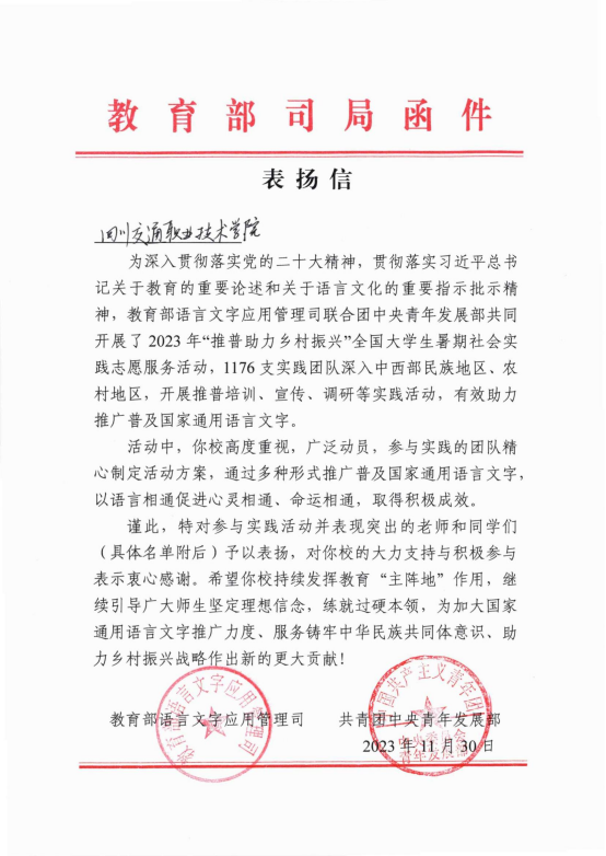 近日,教育部语言文字应用管理司、共青团中央青年发展部共同主办的2023年“推普助力乡村振兴”全国大学生暑期社会实践志愿服务活动评优结果揭晓,学院汽车工程系和轨道交通工程系组成的“石榴籽抱抱队”在全国1176支团队中脱颖而出,获评2023年“推普助力乡村振兴”全国大学生暑期社会实践志愿服务“优秀团队”称号,并获教育部语言文字应用管理司和共青团中央青年发展部来信表扬。