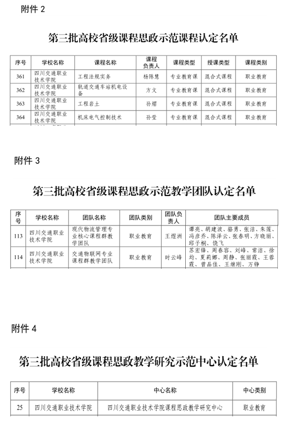 近日,四川省教育厅发布《关于公布第三批高等学校省级课程思政示范项目认定结果的通知》(川教函〔2022〕199号),交职院申报的九个项目全部入选省级课程思政示范项目,包括1个教学研究示范中心、2个示范专业、2个示范教学团队、4门示范课程。