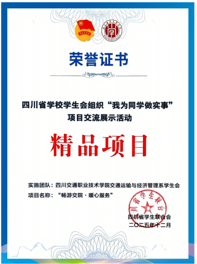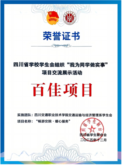 近日,2025年四川省学校学生会组织“我为同学做实事”项目交流展示活动评选结果揭晓。交通运输与经济管理系学生会打造的“畅游交院・暖心服务”项目,凭借鲜明的品牌特色、扎实的服务成效及专业的实践融合模式,从全省214所学校的381个服务同学项目中脱颖而出,成功入选全省30强精品项目,且成为高职院校类别中仅有的5个获奖项目之一。